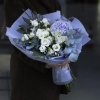 Сomposition: hydrangea, spray rose, alstroemeria, eustoma, eucalyptus, rubella, limonium, dried flowers.