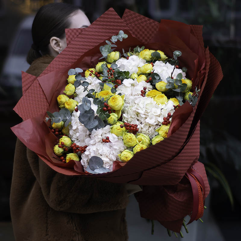 Сomposition: hydrangeas, bush peonies, eucalyptus