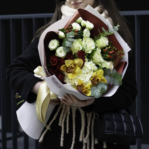 Сomposition: hydrangea, roses, bush roses, orchid, hypericum, eucalyptus, lipidium