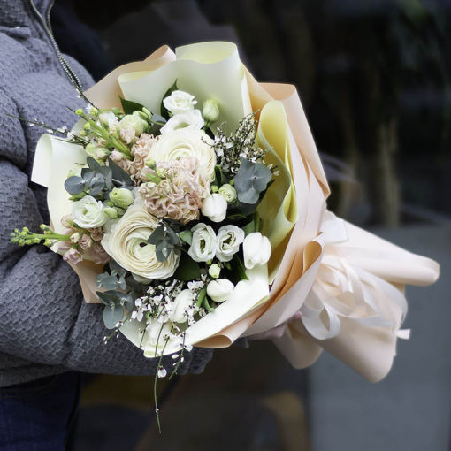 Сomposition: ranunculus, tulips, chameleon, eucalyptus, herbs and exotic supplements