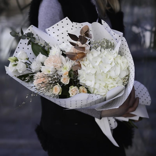 Сomposition: hydrangea, bush rose, eutoma, chrysanthemum, one-bud carnation, genistra, gypsophila, eucalyptus