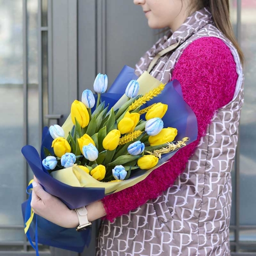 Description: this bouquet looks very symbolic: blue-yellow accent, field applications …. :))