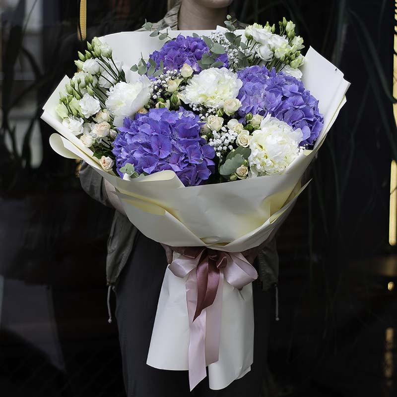 Сomposition: hydrangea, peony, eustoma, bush rose, gypsophila, eucalyptus
