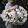 Сomposition: hydrangea, peony, eustoma, bush rose, dahlia, eucalyptus