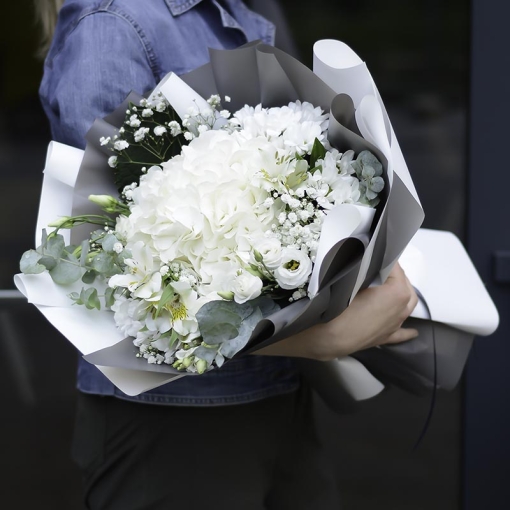 Composition:hydrangea, eustoma, alstroemeria, chrysanthemum, gypsophila, eucalyptus