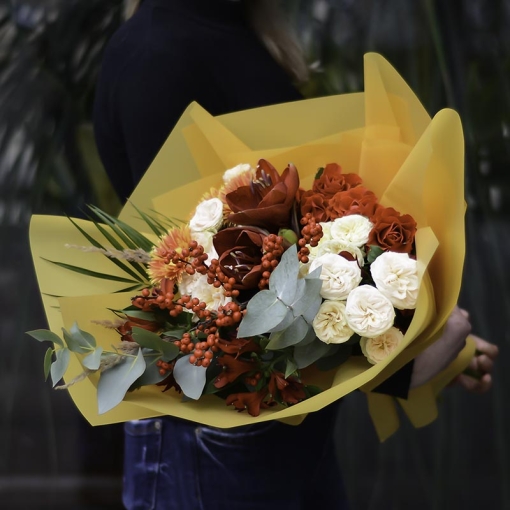 Сomposition: amaryllis, alstroemeria, El Toro rose, gerbera, ilex, bush rose, eucalyptus, dried flowers
