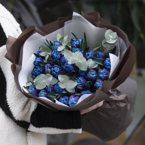 Composition: peony tulip, eucalyptus,