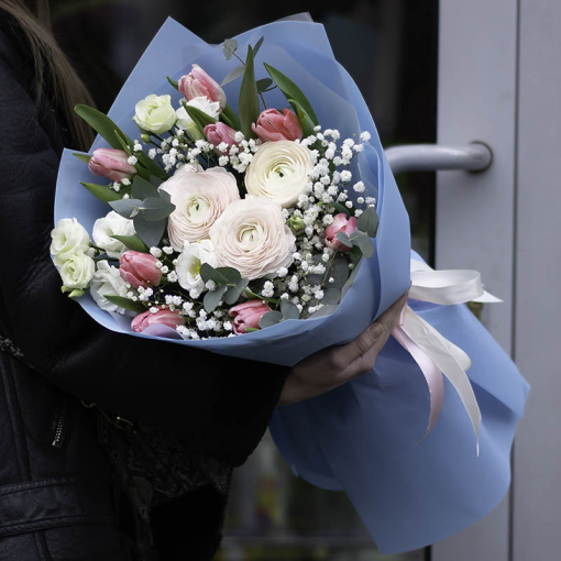 Сomposition: ranunculus, tulips, eustoma, wanda, gypsophila, eucalyptus, bergrass and other greens.