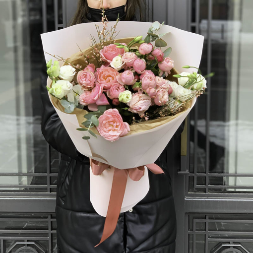 Сomposition: spray rose “Silva Pink”, eustoma, genista, eucalyptus.