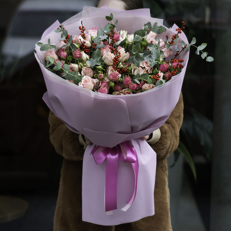 Сomposition: mix of bush roses, ilex, eucalyptus