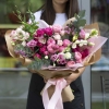 Сomposition: spray rose, peony rose, eustoma, chameleon, freesia, eucalyptus.