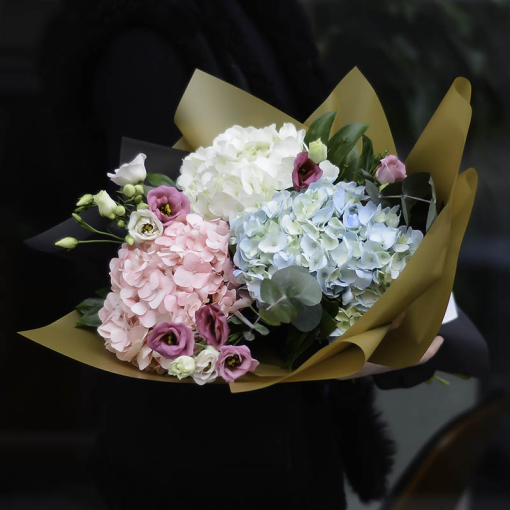 Сomposition: hydrangea, eustoma, eucalyptus