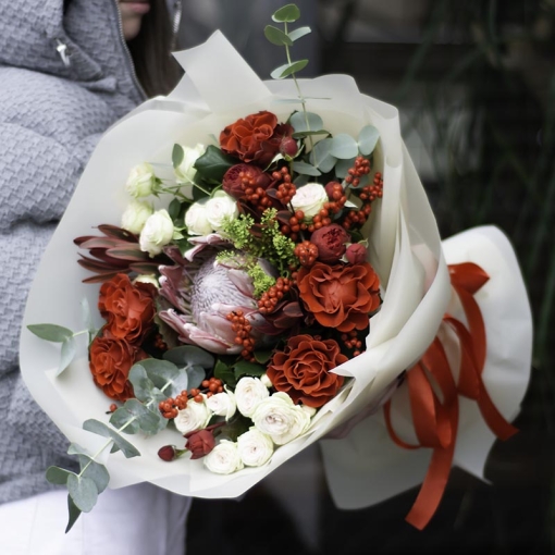 Сomposition: bush roses, single-bud roses, protea, ilex, leucodendron, eucalyptus, lipidium