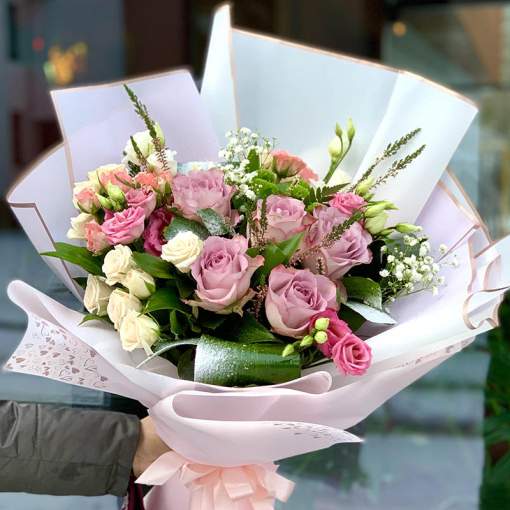 Сomposition: single-headed rose, shrub rose, eustoma, gypsophila, aspidistra and other greens.