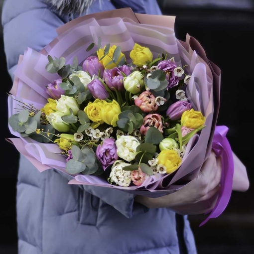Product Composition: multi-colored tulips, eucalyptus, genistra, chamelatio