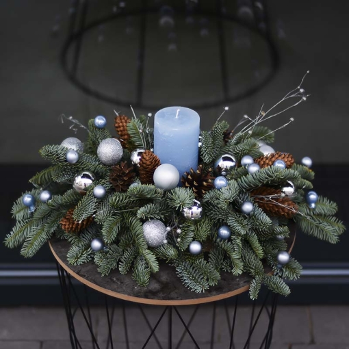 Сomposition: candle, alpine needles (live), cones, dried flowers, decorative ornaments