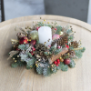 Сomposition: candle, alpine needles (live), cones, dried flowers and decorative ornaments.