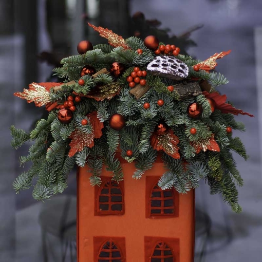 Сomposition: Christmas tree (live) nobilis, artificial ala-ilex, bark, dried cinnamon shelf, decorative ornaments