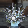 Сomposition: candles, Christmas tree (live) nobilis, painted ilex, skimmy, cones, snow-covered branches (burqa), decorative ornaments