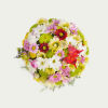 Product Composition: colorful chrysanthemum, one-headed carnation, alstroemeria, chrysanthemum Santini, greenery and decorative components.