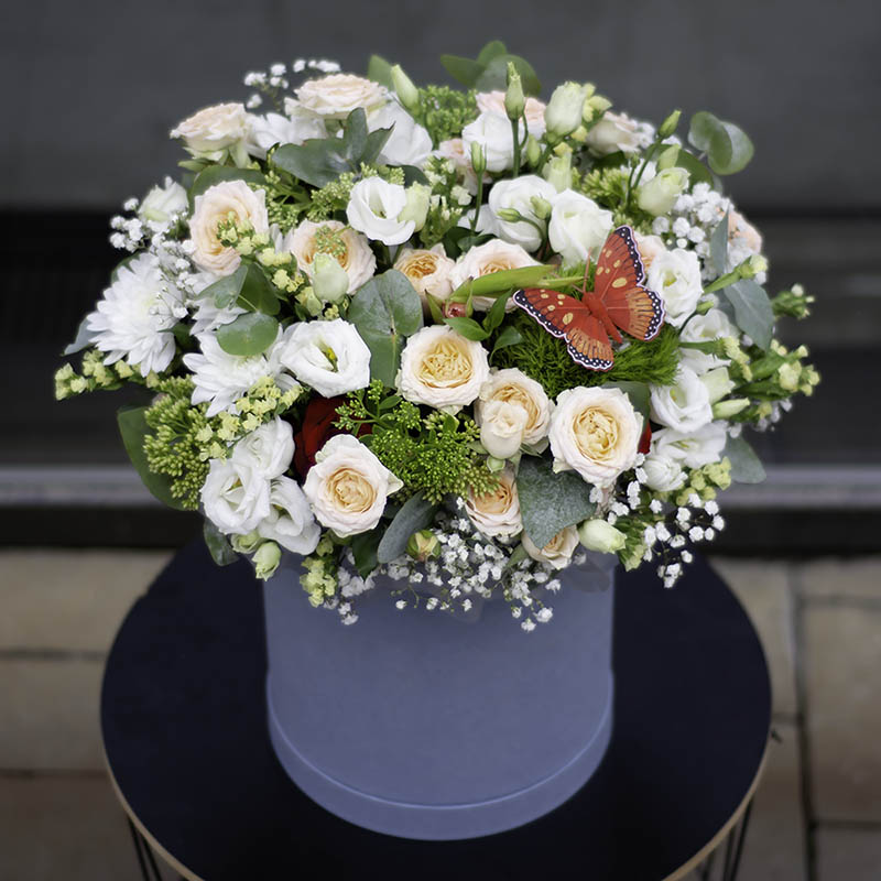 Product Composition: bush roses, eustoma, eucalyptus, gypsophila, field applications and decor.