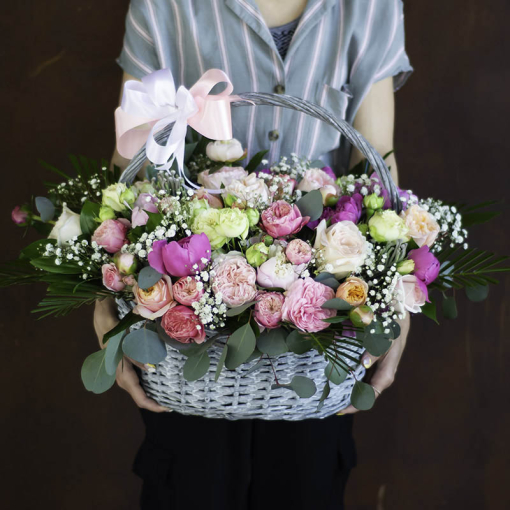 Сomposition: peonies, peony rose, single-headed rose, gypsophila, eucalyptus, rubella, ruscus and other greens.