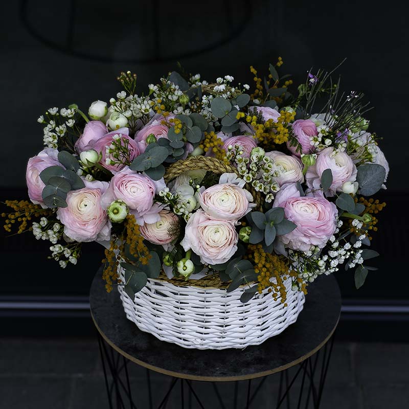 Сomposition: ranunculus, mimosa, chameleon, eucalyptus, flower basket