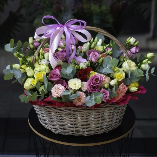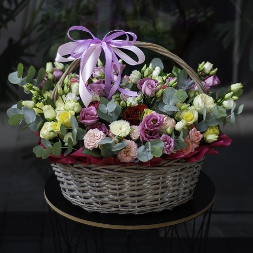 Сomposition: eustoma, bush roses, single-bud rose, eucalyptus.