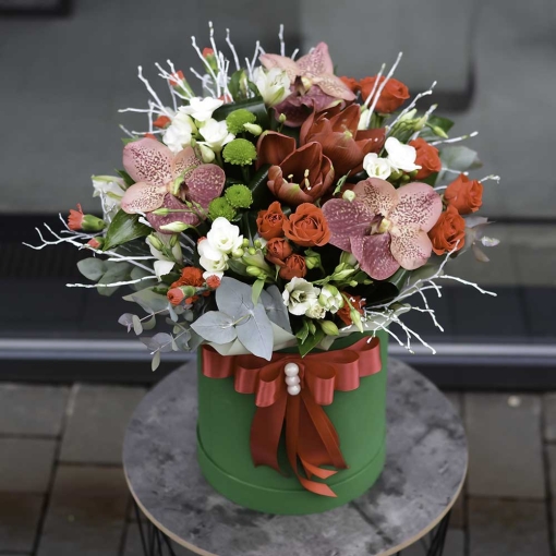 Сomposition: Wanda, amaryllis, rose bush, alstroemeria, freesia, santini, carnation, eucalyptus, aspidistra, greens, decor.