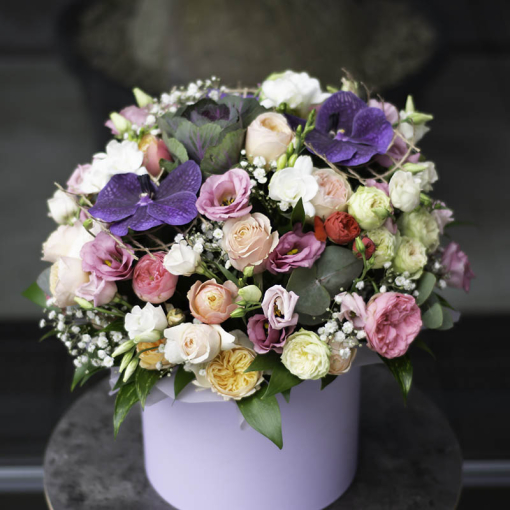 Сomposition: Wanda, peony rose, freesia, eustoma, brassica (ornamental cabbage), gypsophila, eucalyptus, greens.