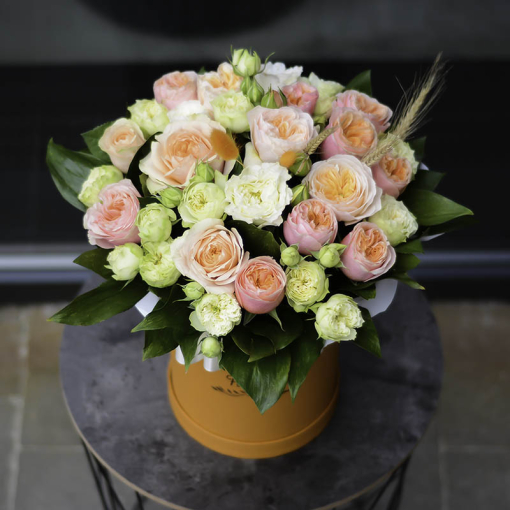 Сomposition: spray peony rose, single-bud peony rose, ruscus, lagurus and decorative spikelets