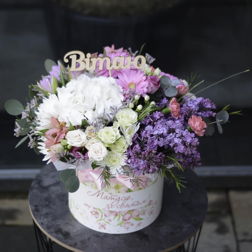 Сomposition: hydrangea, rose bush, eustoma, carnation bush, alstroemeria, chrysanthemum, tulips, lilac, chamelatio, hypericum, gerbera, limonium (statica), eucalyptus, greens