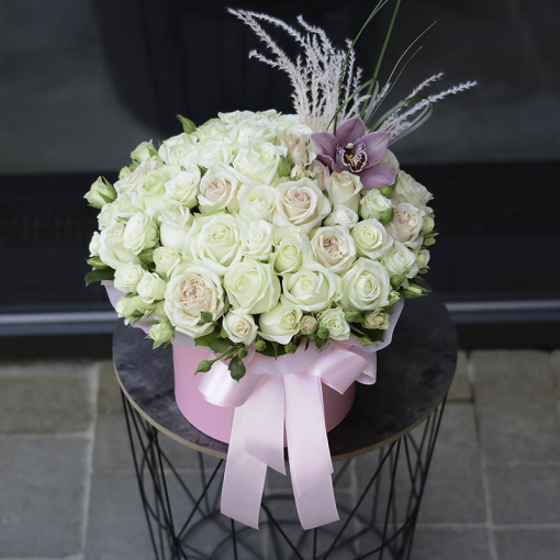 Сomposition: single-bud (short) rose Avalanche and Avalanche Peach, spray rose, orchid, decor