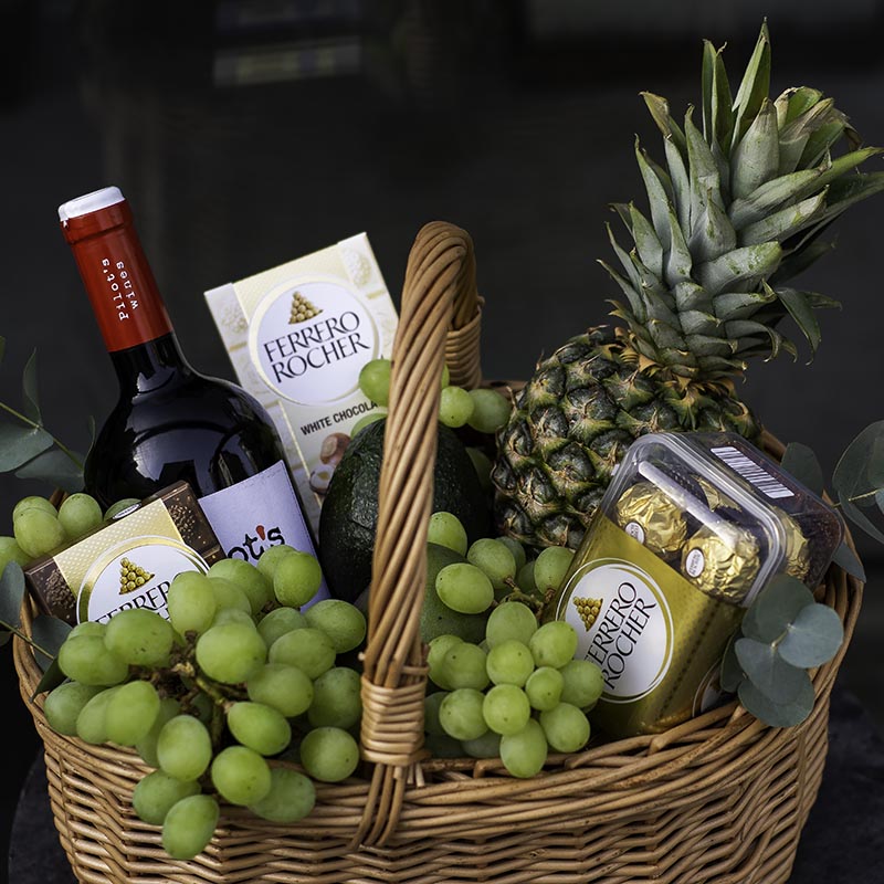 Ingredients: basket, Pilot’s Wines red semi-sweet wine, Ferrero Rocher candies, Ferrero Rocher white chocolate, Ferrero Rocher milk chocolate, pineapple – 1 pc., mango – 1 pc., avocado – 1 pc., grapes.