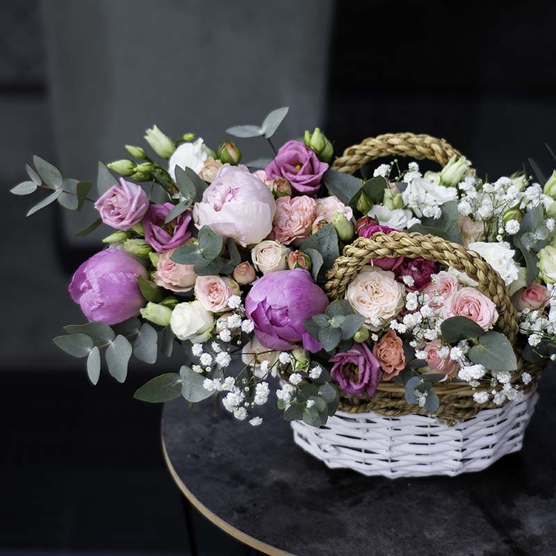 Сomposition: peonies, eustoma, bush roses, gypsophila, eucalyptus.