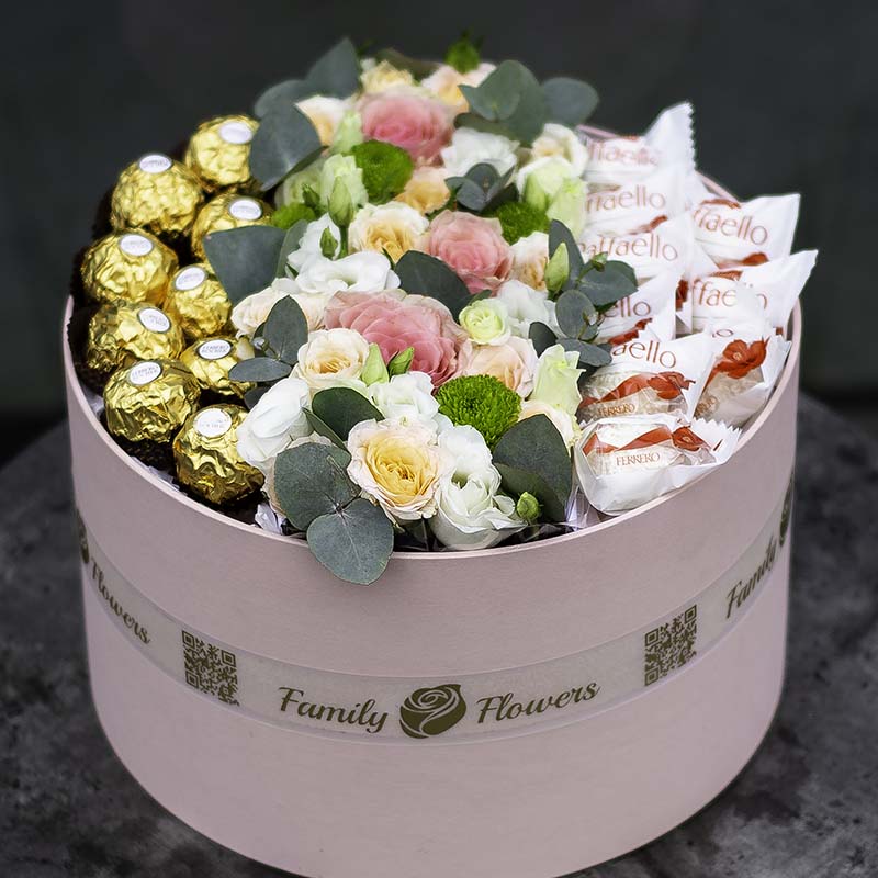 Product Composition: rose, bush rose, eustoma, santini, eucalyptus, 9 Ferrero Rocher candies, 9 Raffaello candies.
