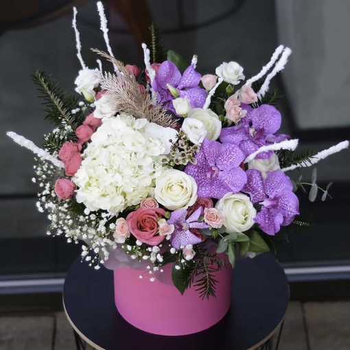 Product Composition: spray rose Lady Bombastic, chrysanthemum Santini, brunia, branched carnation, orchid, tulip, eustoma, alstroemeria, eucalyptus, fir-tree and other greenery.