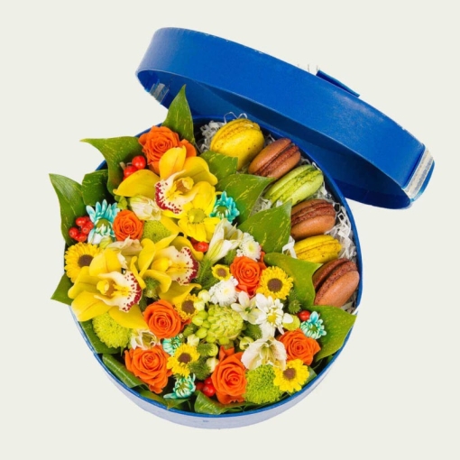 Product Description: The yellow and orange colors of the flowers which contrast with the blue color of the box, in which these flowers are placed, give to this composition richness, freshness and brightness.