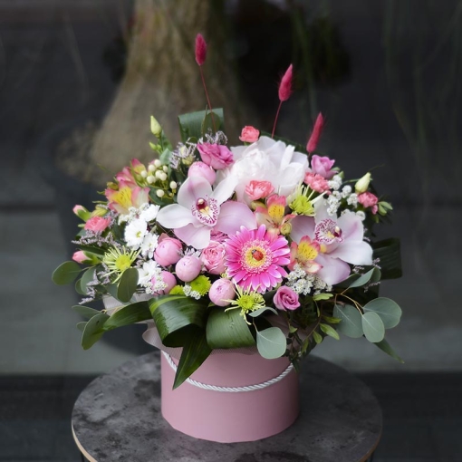 Сomposition: peony, gerbera, orchid, rose bush, alstroemeria, eustoma, carnation bush, hypericum, santini, aspidistra, eucalyptus, greens, lagurus.