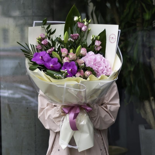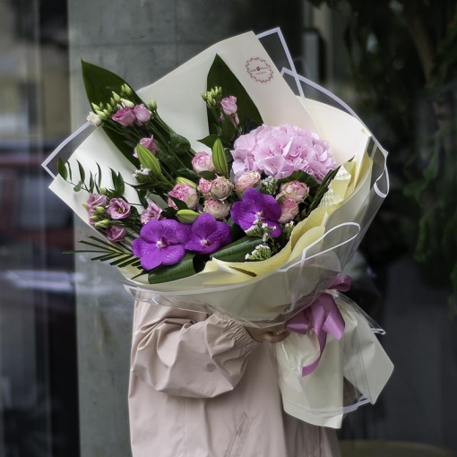 Product Composition:  hydrangea, lily, eustoma, bush rose, orchid, greens.