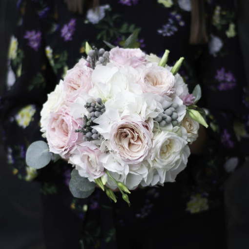 Сomposition: peony rose, hydrangea, eustoma, brunia, eucalyptus.