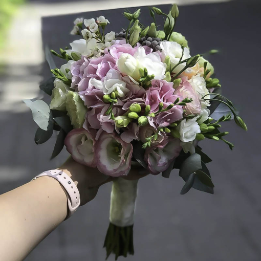 Сomposition: hydrangea, freesia, peony rose, eustoma, chameleon, brunia, eucalyptus.