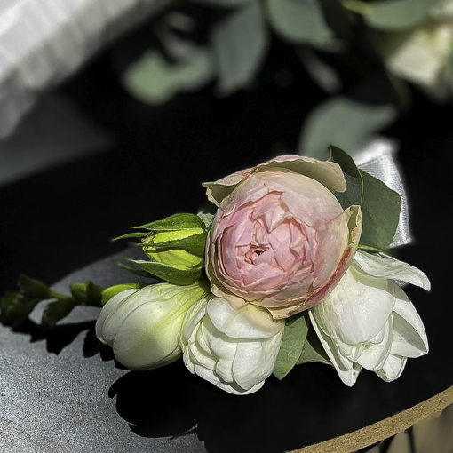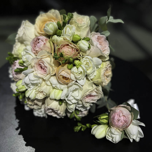 A bouquet for the bride and a boutonniere for the groom.