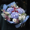 Склад: гортензія, еустома, жоржини, кущові піоновидні троянди, гіпсофіла, евкаліпт, польові додатки.
