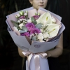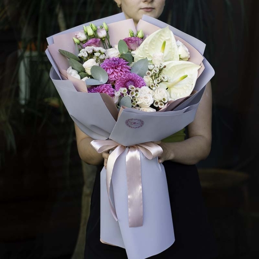 Склад: антуріум, жоржини, кущові трянди, еустома, хамелаціо, евкаліпт.