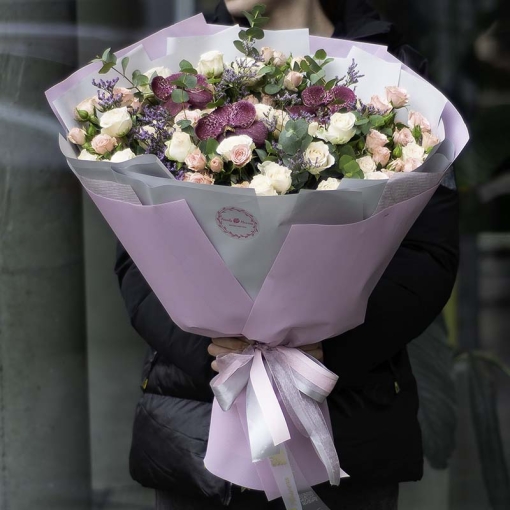 Опис: поєднання рожевих троянд разом із фіолетовими орхідеями, творить чарівний тандем пурпурових відтінків у цьому букеті.